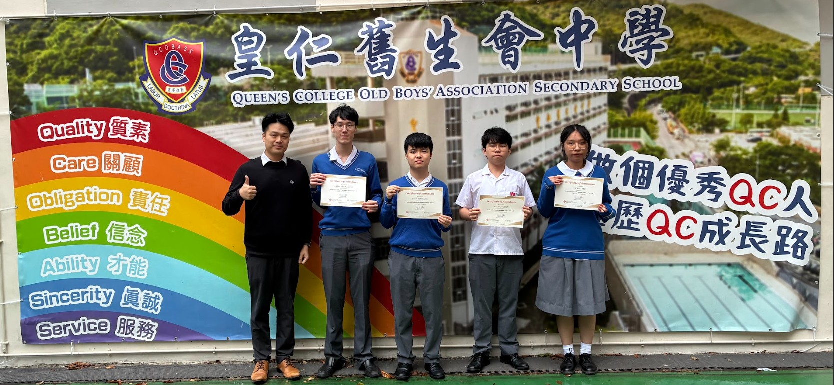 本校四位6A班同學(右起: 葉圩鐿、胡根臻、戚皓泓、羅卓匡、鄧曉進老師)於暑假期間,完成了香港理工大學應用數學系資優教育課程,以及通過SNC 國際數學能力測試(中學組)評估。恭喜以上勤奮而且好學的同學。