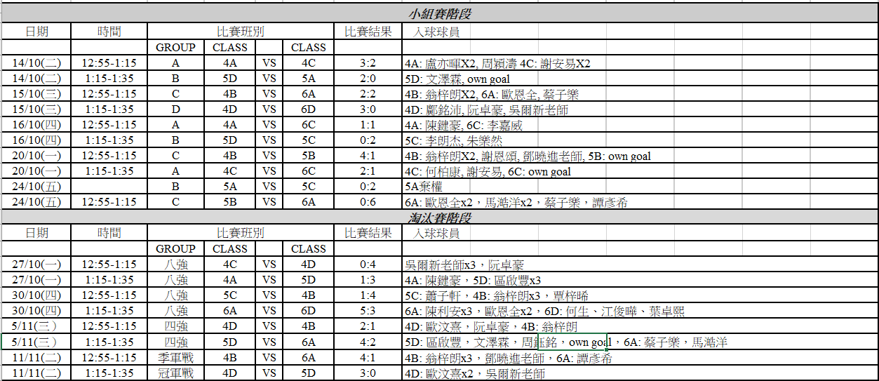 最後,感謝一眾師生參與有關賽事,並到場觀戰及打氣,亦感謝足球學會幹事協助賽事進行,我們來年再見!另外,下學期將會上演「初級組班際足球比賽」及「皇超聯」比賽,敬請留意!