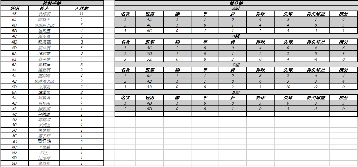 由足球學會主辦的「高級組班際足球比賽」於10月14日至11月11日舉行,有破紀錄的十一隊參加,午膳期間於籃球場上演一場又一場精彩賽事。經過激烈的分組賽及八強賽後,4B班、4D班、5D班及6A班晉身四強,再經過兩場扣人心弦的四強大戰後,由4D班與5D班爭奪冠軍寶座,最後由4D班以三比零大勝5D班,奪得冠軍!而季軍則由4B班奪得。神射手方面,4B班翁梓朗以11球勇奪首名,而4D班吳爾新老師及6A班歐恩全則以5球獲得第二名。