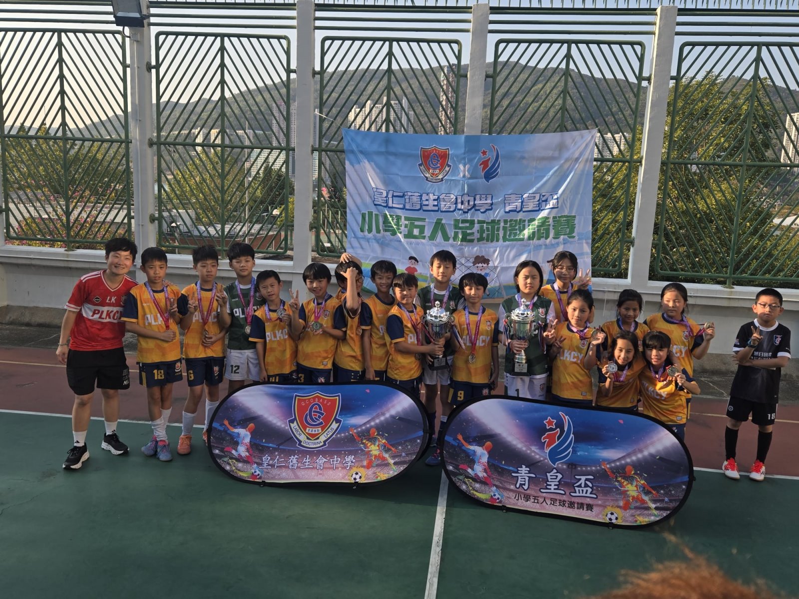 保良局陳溢小學的男、女子隊員及領隊老師於得獎後合照