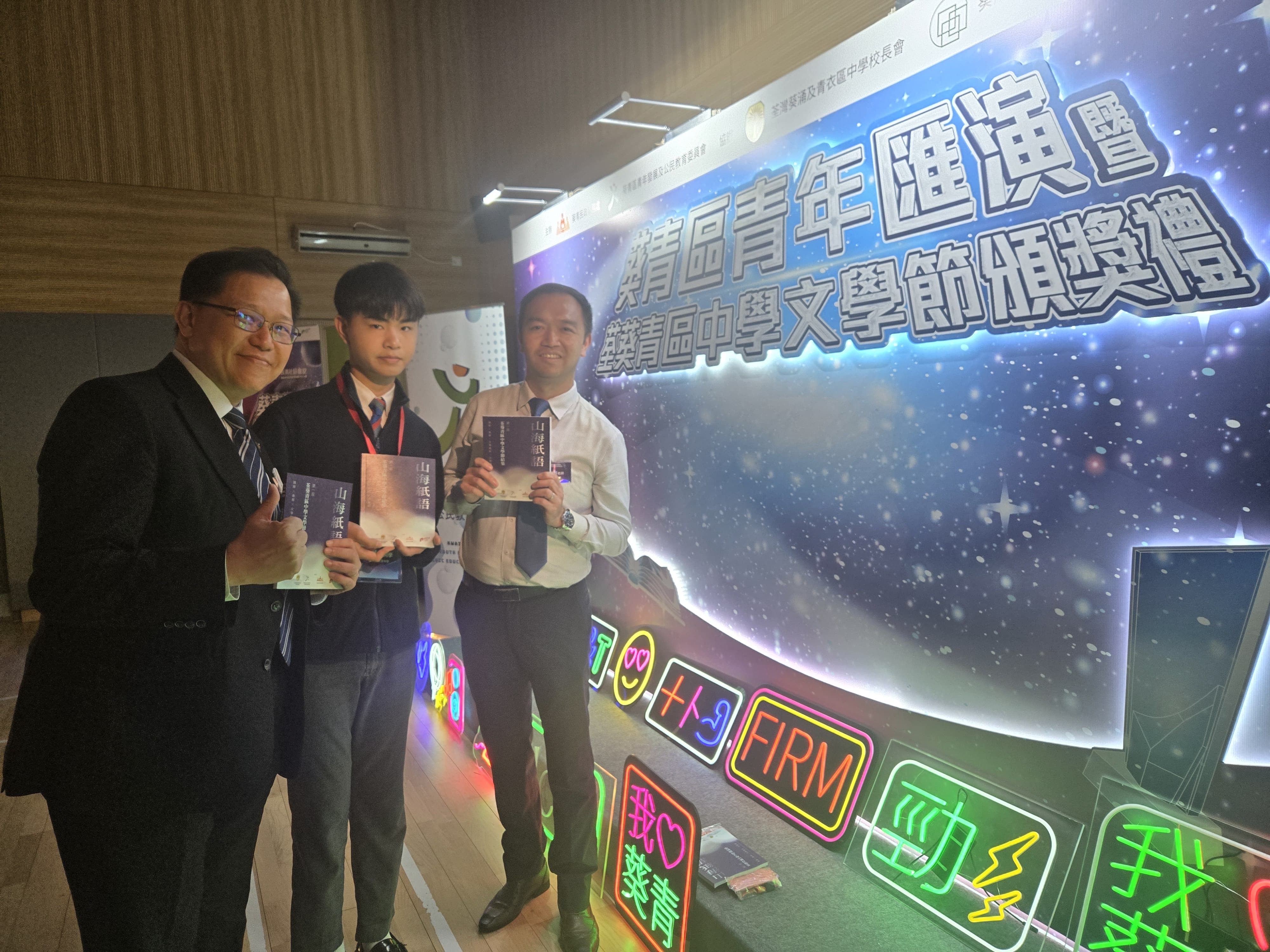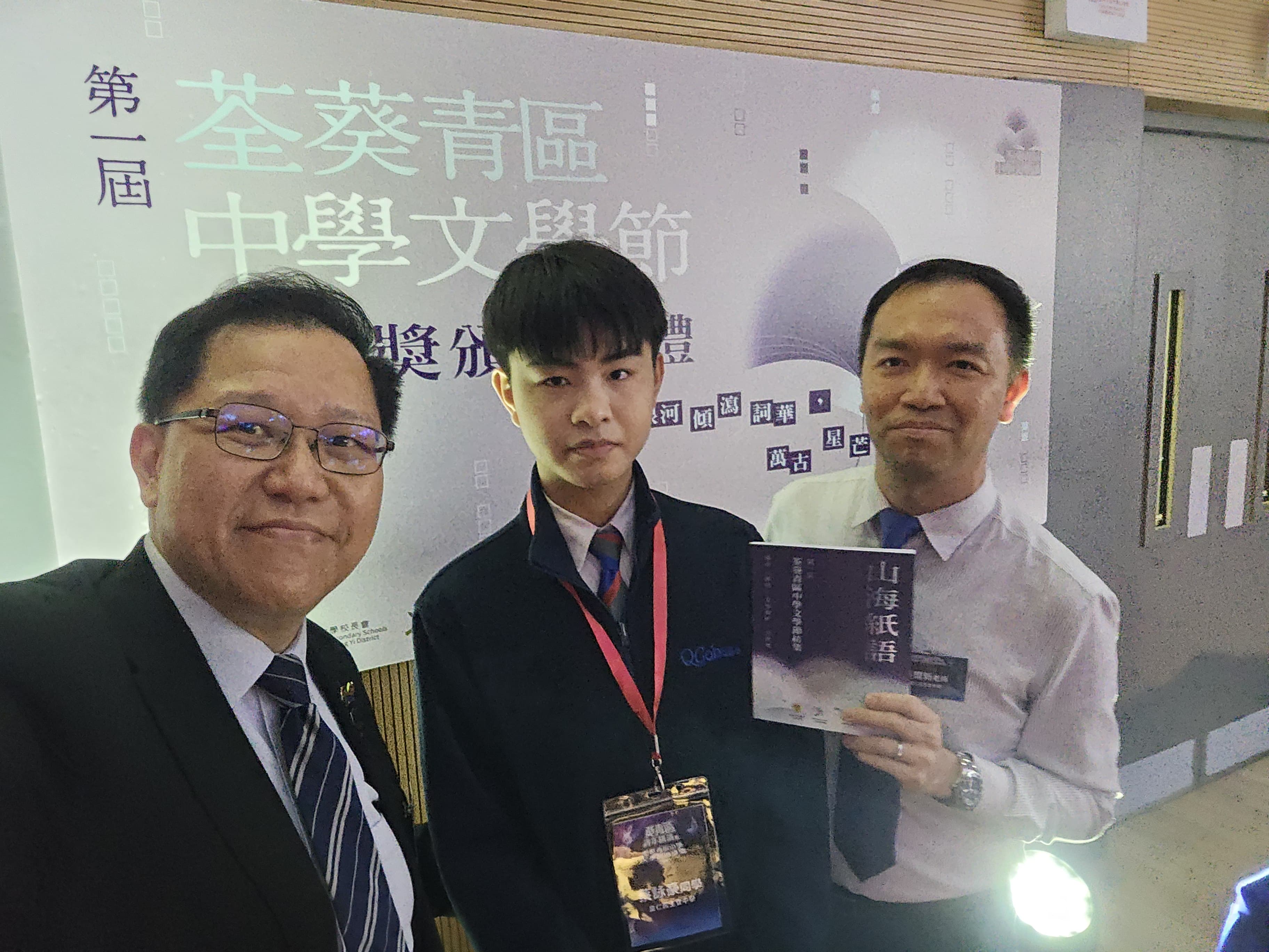 由「荃灣葵涌及青衣區中學校長會」和「葵青區青年發展及公民教育委員會」合辦的「第一屆荃葵青區中學文學節」徵文比賽頒獎典禮於2026年3月21日隆重舉行!本校同學4B蔡詠豪憑文章:〈春水煎茶荔枝碗〉,以真摯筆觸鋪寫荃葵青區的人、事、物、景,將熟悉社區化為動人文字,在眾多參賽者中脫穎而出,榮獲高中散文組優異獎!有關作品亦被收錄於文學節出版的文集:《山海紙語》之中!